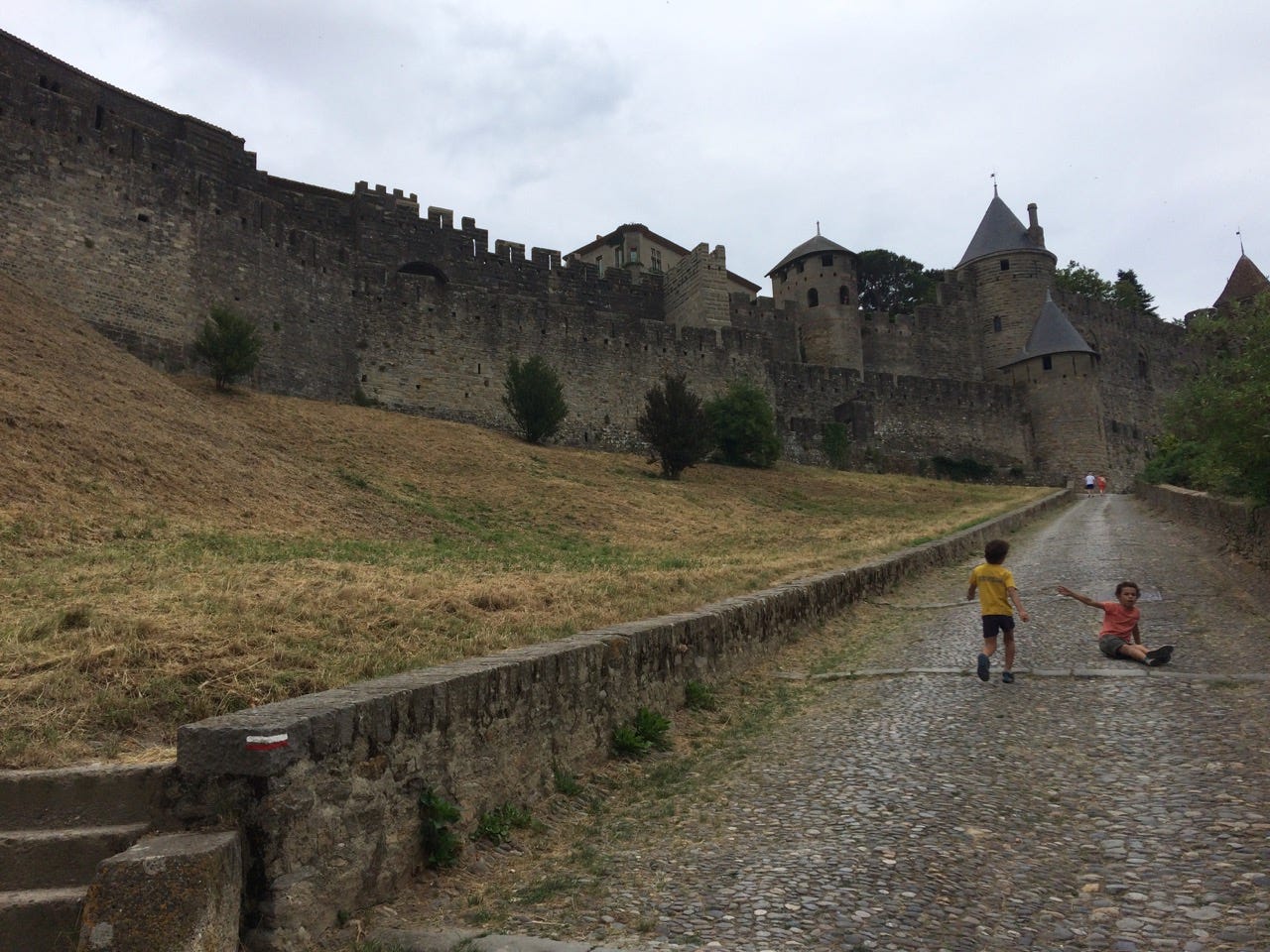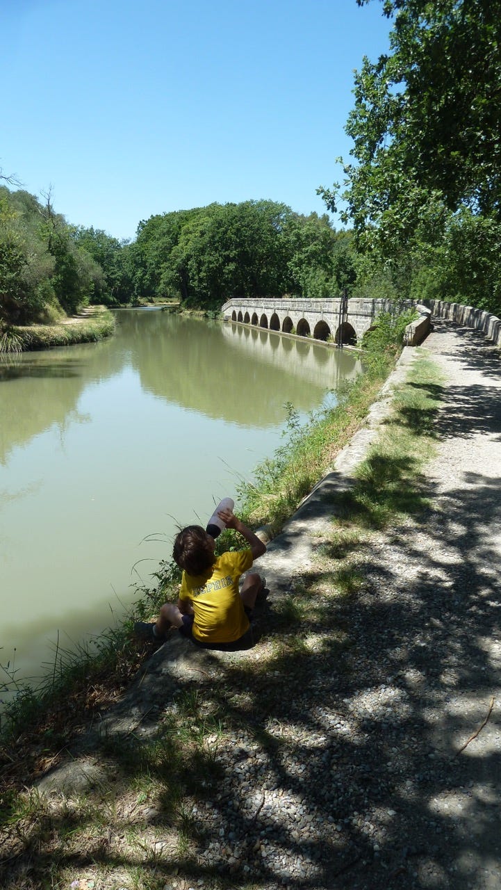 Prochaine étape, Castelnaudary. Les enfants veulent aller aux toilettes ( “des vraies, papa, pas à la turque”, chacun ses priorités ) je suis crevé, on s’arrête dans un camping, et là, comble du luxe : une douche chaude. Un cassoulet plus tard, ça va mieux.