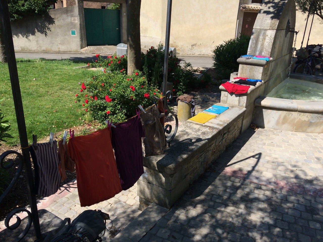Le lendemain, sur la place de Villesèquelande, je sors mon savon et je lance la lessive dans la fontaine du village. Je suspends tout ça et transforme la place en camp de romanichelles pour quelques heures, sous un arbre de Sully. Le temps que ça sèche, j’envoie les enfants au musée de la chevalerie ( https://www.musee-chevalerie.fr/ ) et Gilles, le propriétaire des lieux, montrent aux enfants une heure durant tous les usages de l’époque. Si vous devez choisir entre Carcassonne la touristique et le musée de Gilles, n’hésitez pas, deuxième option, inoubliable.