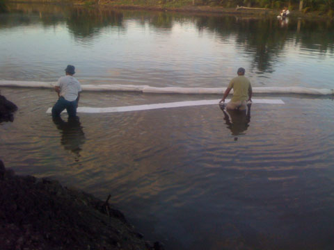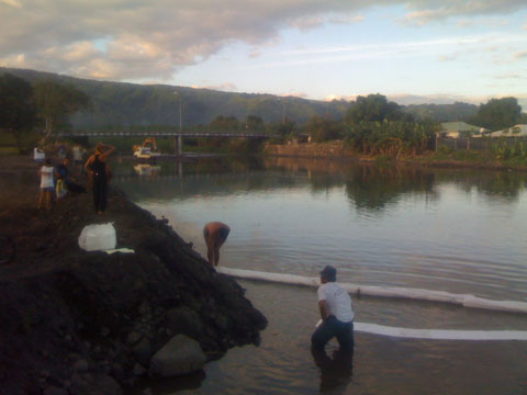 En sortant de l’eau aujourd’hui à Papara, j’ai eu le plaisir de constater que l’embouchure de Taharu’u est le théatre d’extraction (à la pelleteuse) visiblement dans le cadre d’une autorisation délivrée par le maire de Papara. Je vous laisse juger de l’impact sur la rivière… De plus, la machine outil a pété une durite au sens propre, et la polution à l’huile s’est répandue dans l’embouchure et sur le . Visiblement équipé, le ministère de l’équipement a mis (un peu tard) un barrage anti polution (qu’ils auraient pu mettre de manière préventive, non…) Ca a été l’occasion pour moi de constater que les douches de Papara sont toujours dans le même état…