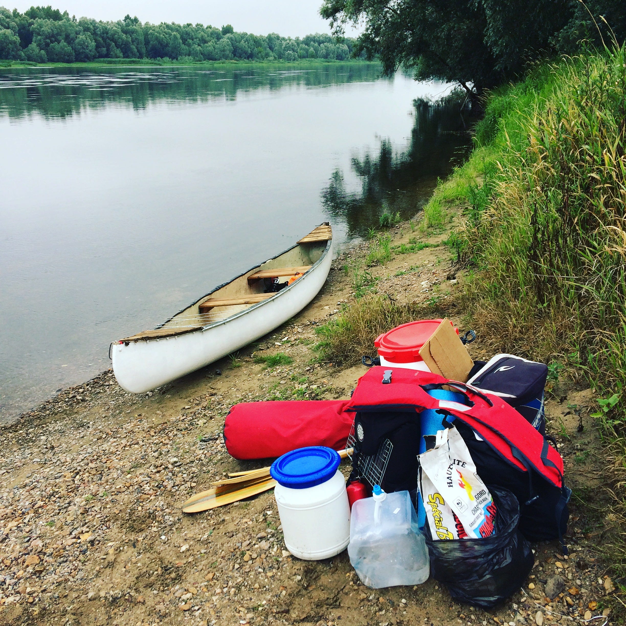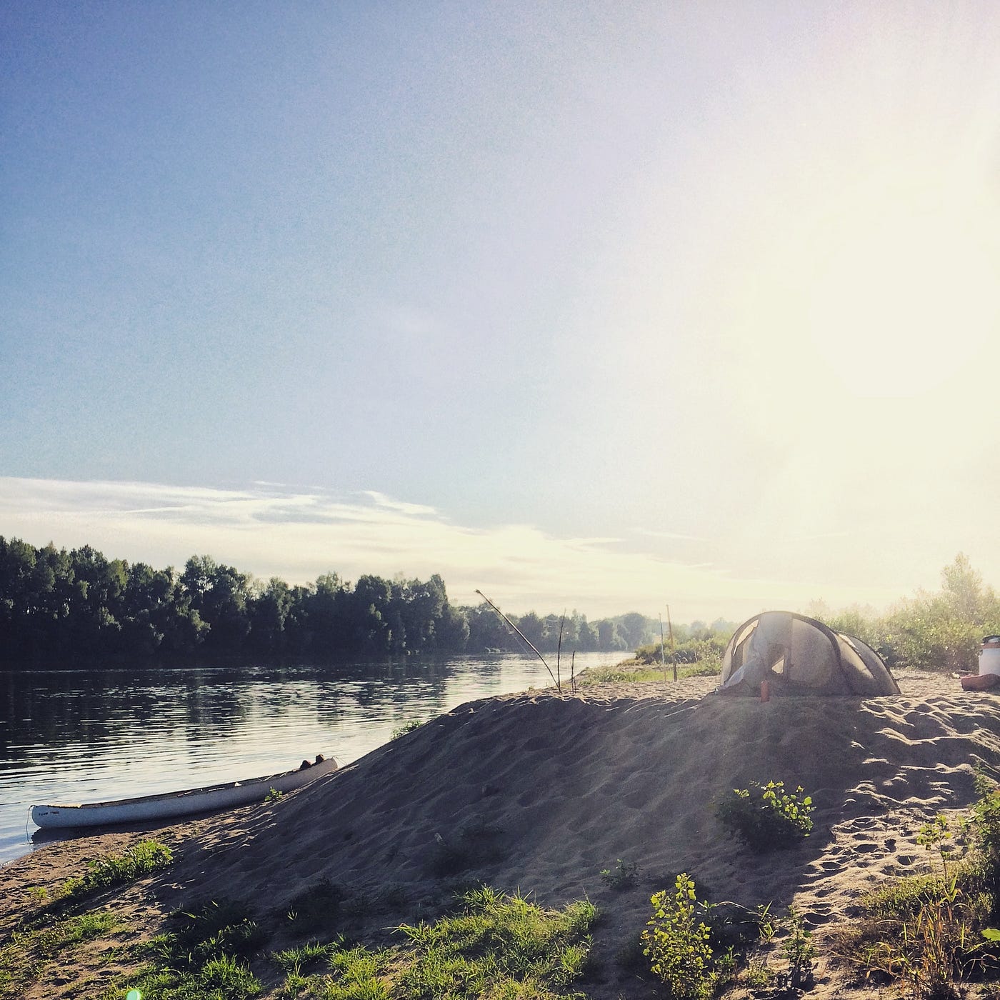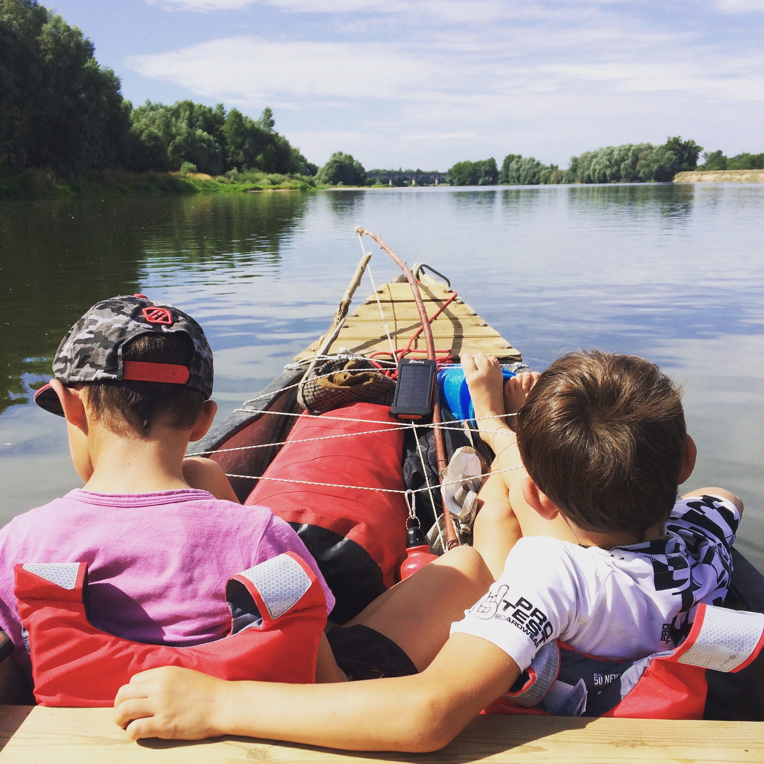 Début juillet, ça y est, nous sommes prêts. Départ pour Blois, quelque peu mouvementé par les grèves de la SNCF. 14h plus tard, nous nous retrouvons à 1h du matin à tenter par tous les moyens de rejoindre la base nautique de Vineuil. Arrivés épuisés et en pleur, j’emballe — littéralement — les enfants dans les duvets et le tarp pour résister aux averses. Le lendemain, à l’aube, je vais chercher le canoë que j’avais caché non loin de là, chez l’habitant.
